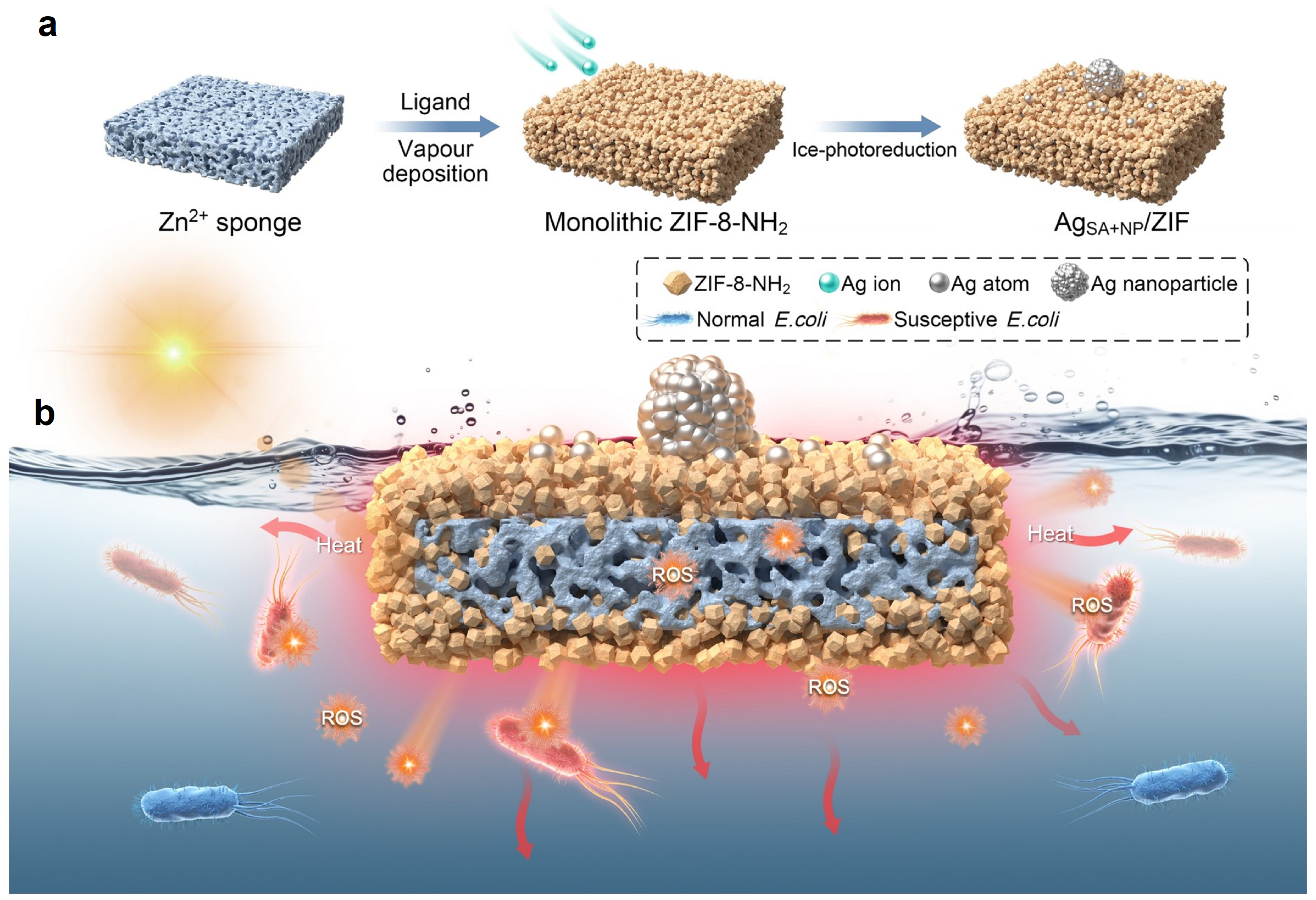 提出了一种新型漂浮整体光催化剂体系,由银单原子 (AgSA) 和银纳米颗粒 (AgNP) 同步负载于整体ZIF-8-NH2载体上,命名为AgSA+NP/ZIF。AgSA+NP/ZIF可以像片剂一样投入水体进行消毒,即便于进行回收,又能实现重复利用。在自然光照射下,AgSA+NP/ZIF的光热效应与光生ROS协同作用,能够有效灭活营养贫乏地表水中的高抗性细菌。